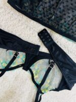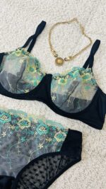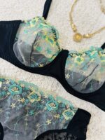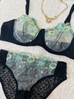 ست فنر دار اروپایی مشکی تور سفید با گلدوزی سبز و زرد